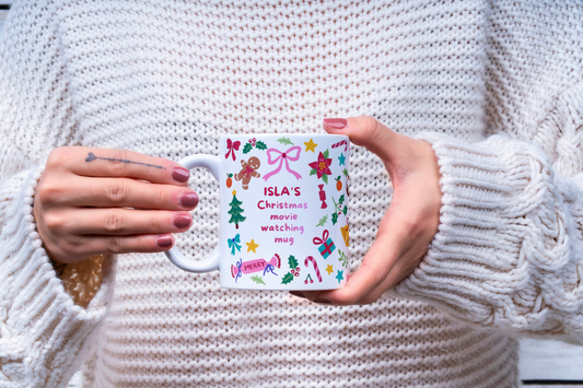 Personalised Christmas Movie Mug with Custom Name, Hand Drawn Holiday Design
